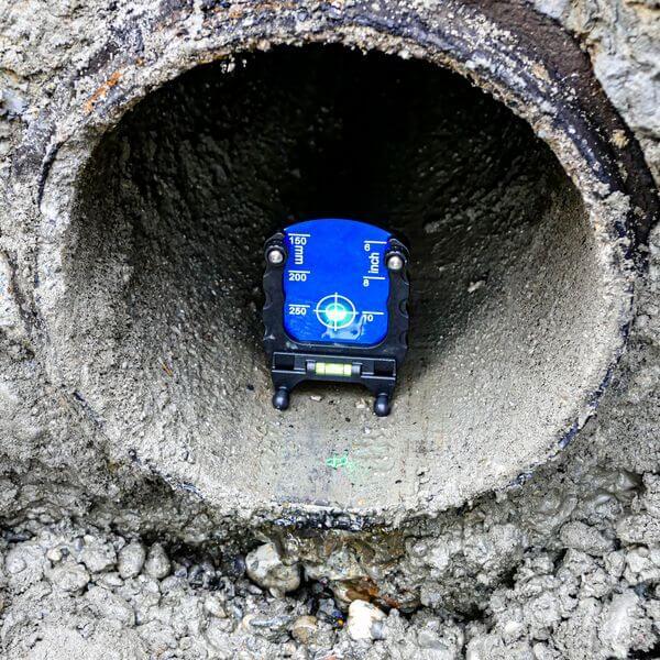 Höhenverstellbare Zieltafel mit Röhrenlibelle für DN 150, 200 und 250mm. Der Laser muss auf entsprechenden Füßen stehen.