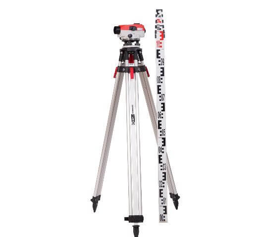 optisches Nivellier mit 24-facher Vergrößerung, Objektivöffnung: 40mm, Teilkreis 400 gon, Genauigkeit: 2,0mm auf 1 km Doppelnivellement, Kompensator luftgedämpft, IP54, Gewicht: 1700g