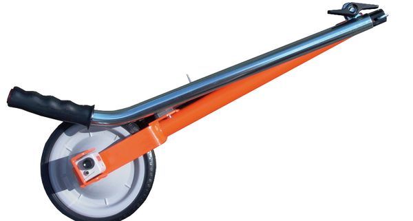 Vollrad, Kunststoff, klappbare Führungsstange, mit Abstellbügel, integrierte Bremse, Qualitätszählwerk erfasst Strecken in Laufrichtung und subtrahiert gegen die Laufrichtung